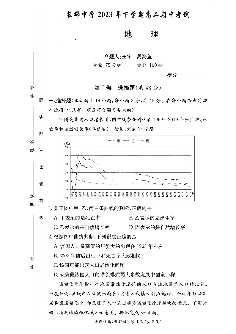 湖南省长沙市长郡中学2023-2024学年高二上学期期中考试 地理