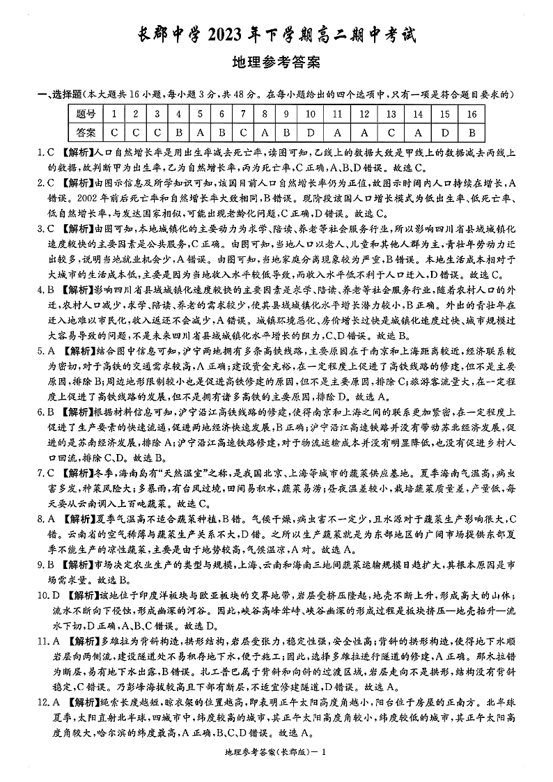 湖南省长沙市长郡中学2023-2024学年高二上学期期中考试 地理答案