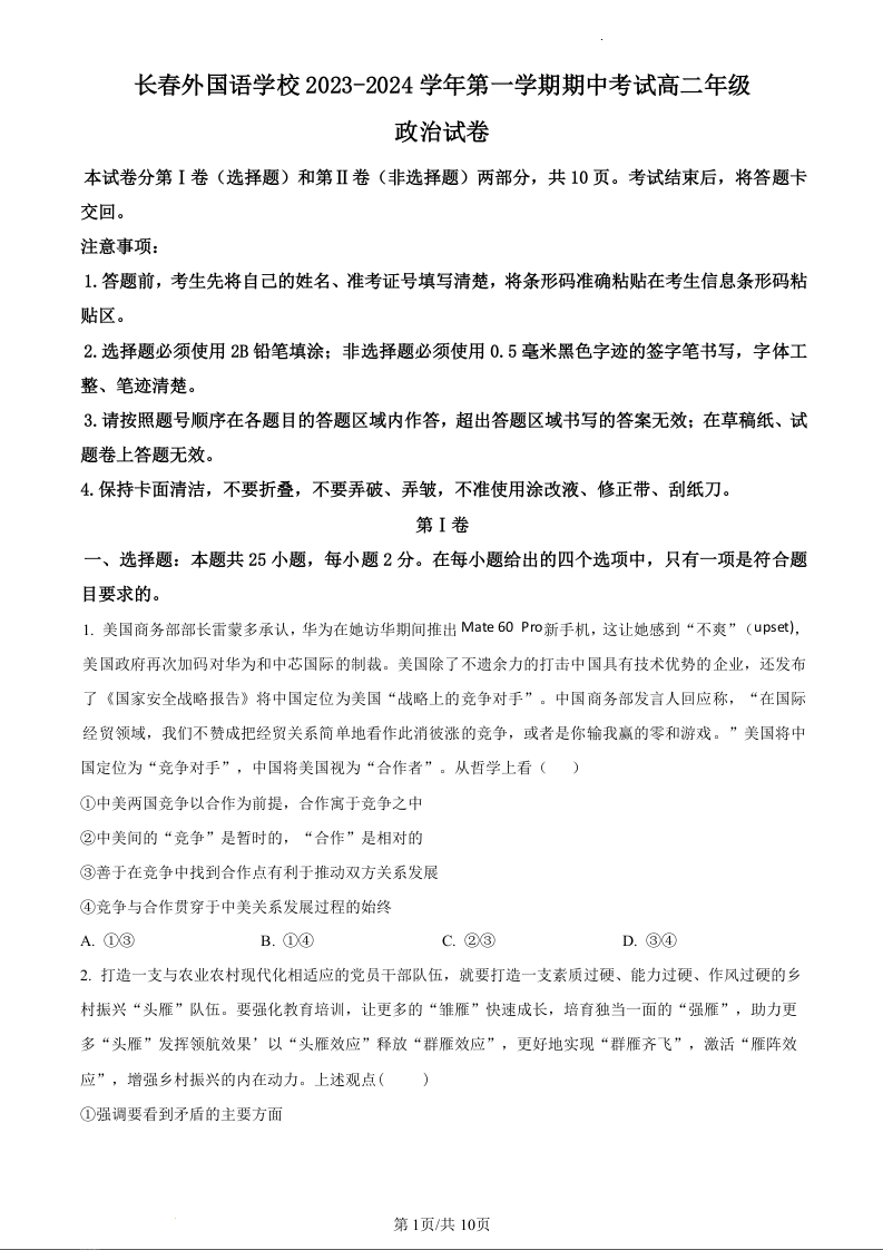 吉林省长春外国语学校2023-2024学年高二上学期11月期中试题政治(原卷版)