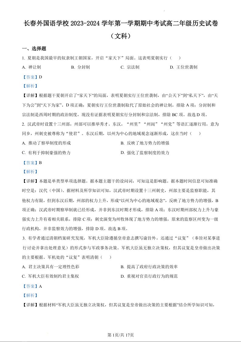 吉林省长春外国语学校2023-2024学年高二上学期11月期中试题历史(精品解析版)