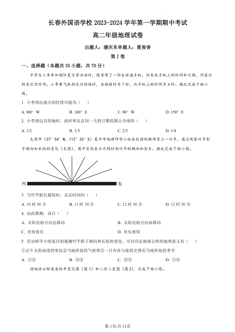 吉林省长春外国语学校2023-2024学年高二上学期11月期中试题地理(原卷版)