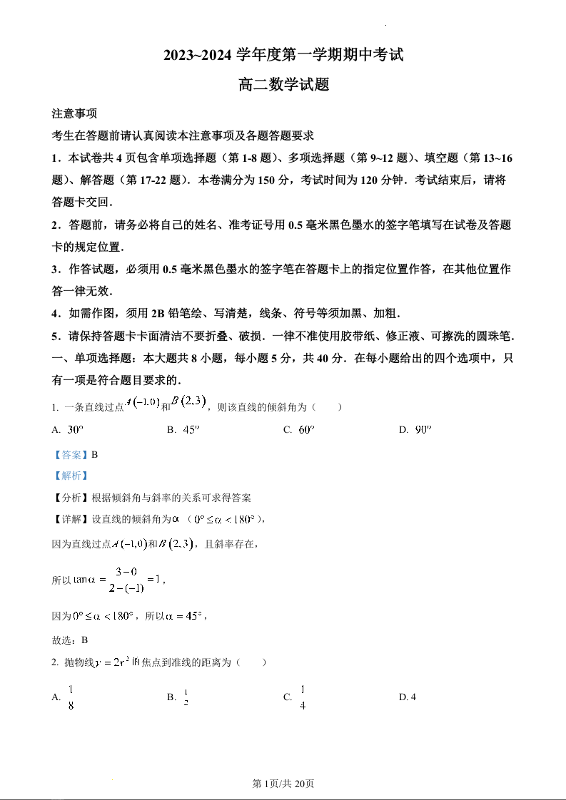 江苏省徐州市2023-2024学年高二上学期11月期中试题数学(精品解析版)
