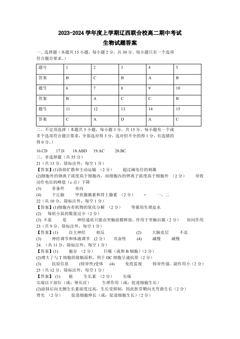 辽宁省辽西联合校2023-2024学年高二上学期期中考试试题生物答案