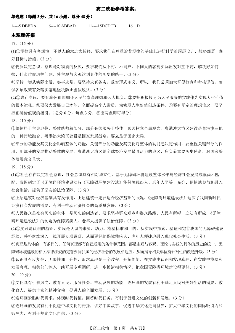 辽宁省辽西联合校2023-2024学年高二上学期期中考试试题政治答案