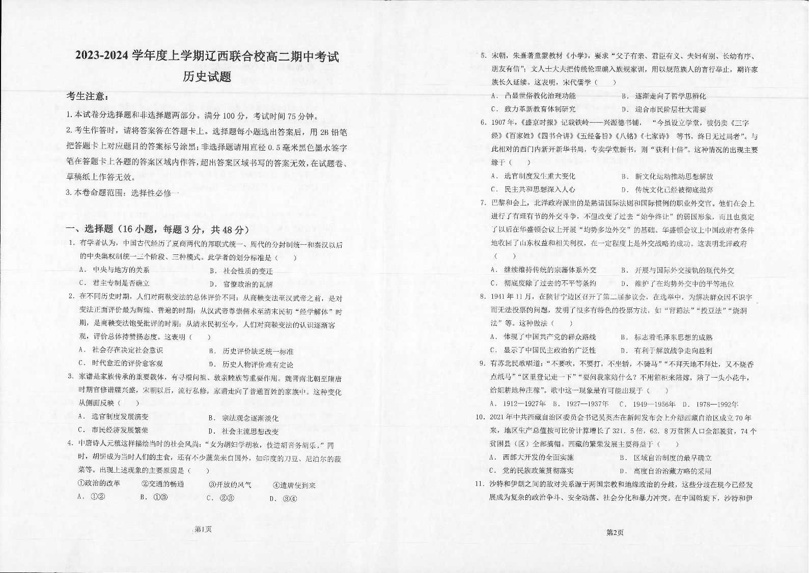 辽宁省辽西联合校2023-2024学年高二上学期期中考试试题历史