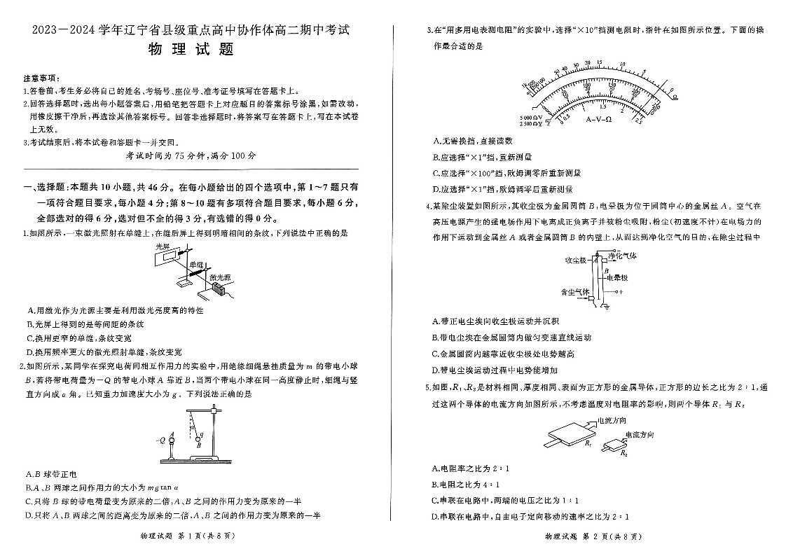 辽宁省县级重点高中协作体2023-2024学年高二上学期期中考试物理