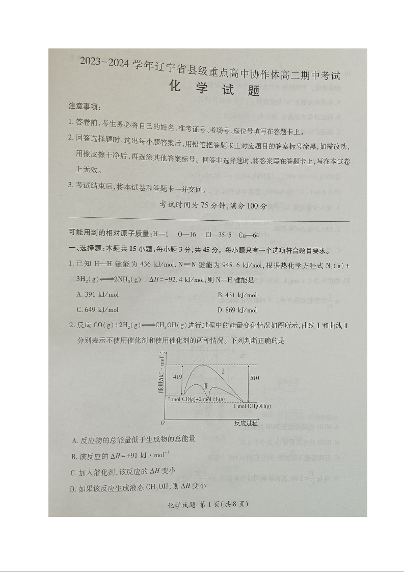 辽宁省县级重点高中协作体2023-2024学年高二上学期期中考试化学
