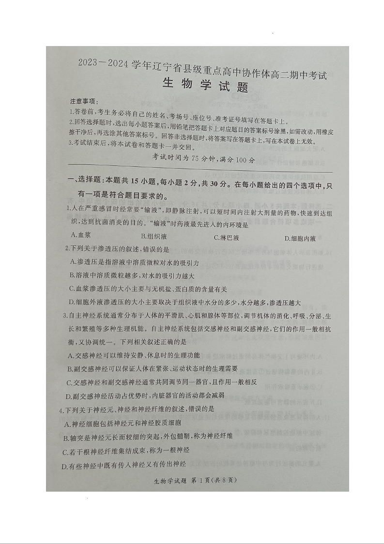 辽宁省县级重点高中协作体2023-2024学年高二上学期期中考试生物
