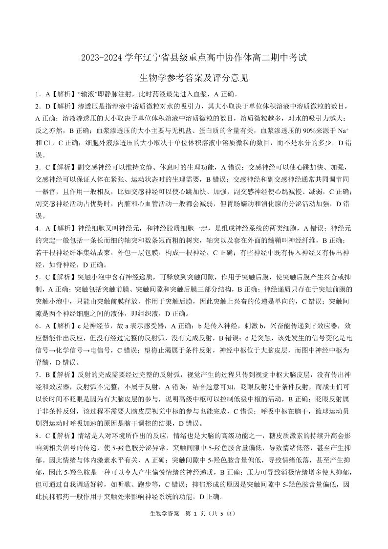 辽宁省县级重点高中协作体2023-2024学年高二上学期期中考试生物答案