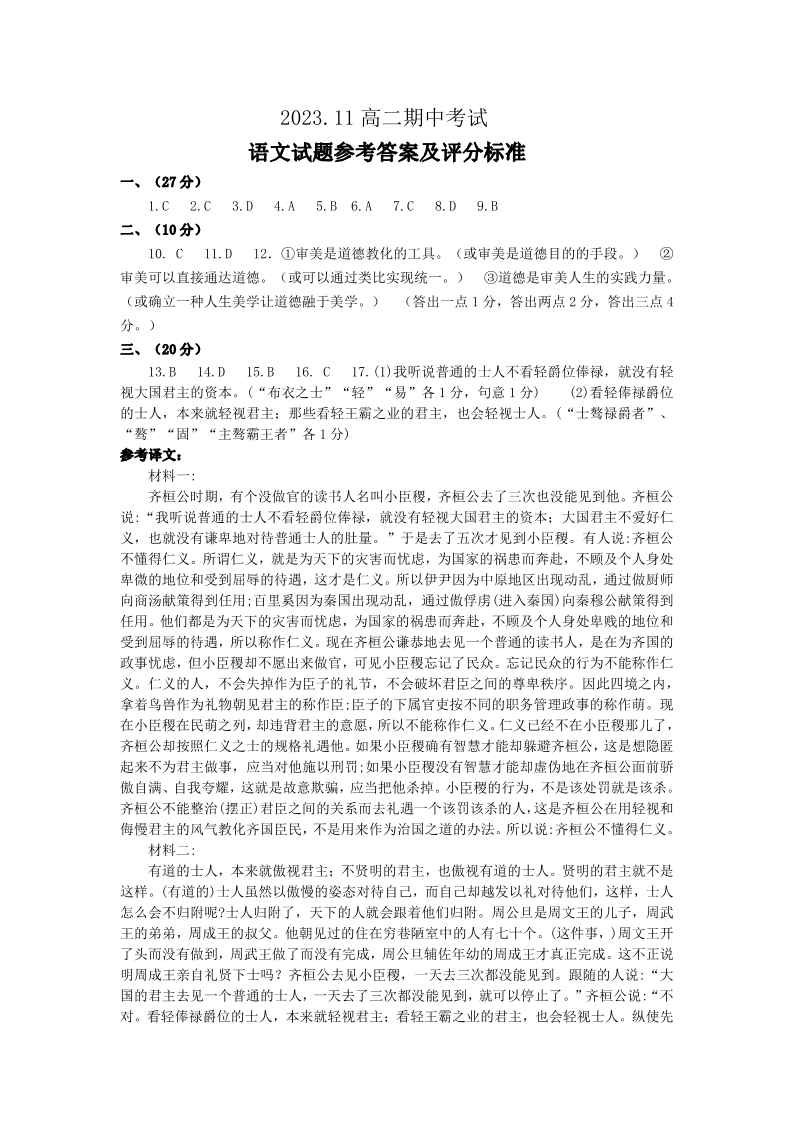 山东省名校考试联盟2023-2024学年高二上学期期中考试语文答案