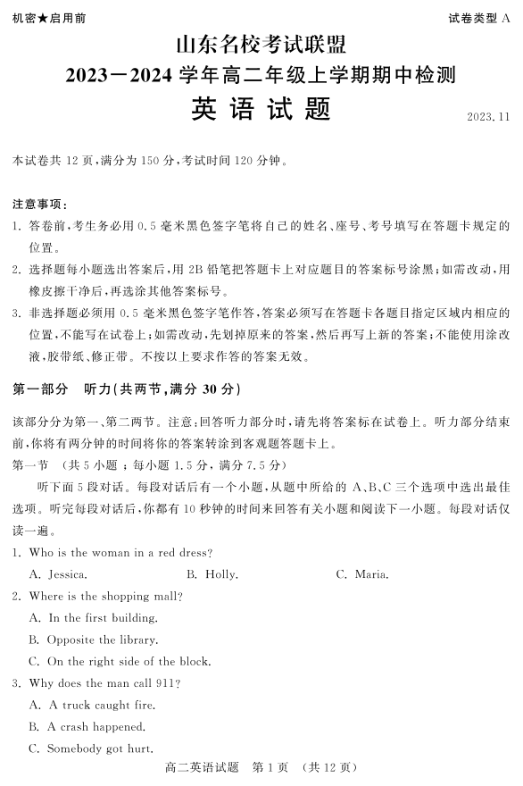 山东省名校考试联盟2023-2024学年高二上学期期中考试英语
