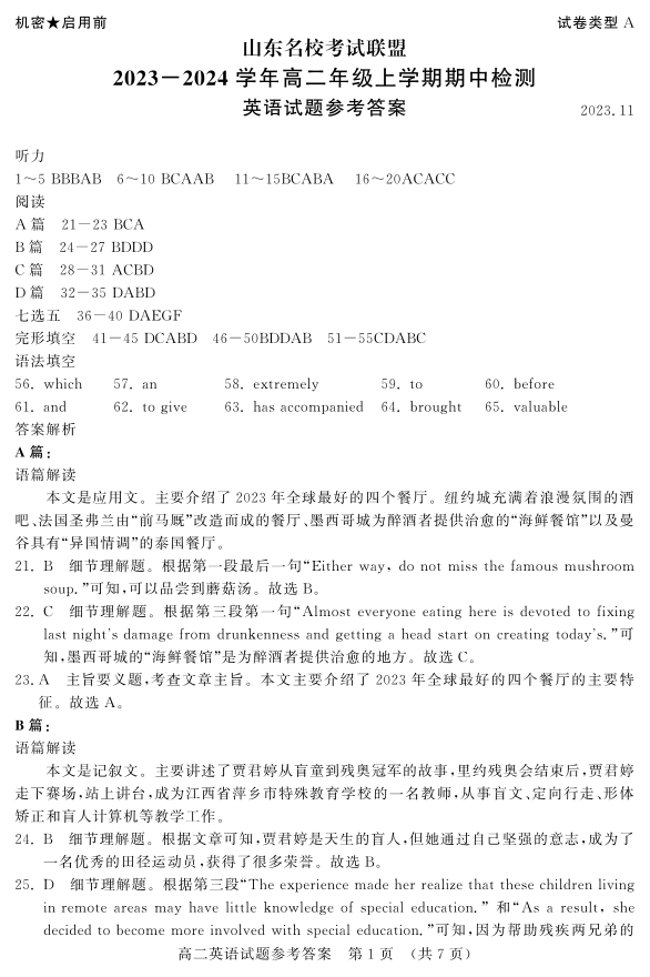 山东省名校考试联盟2023-2024学年高二上学期期中考试英语答案