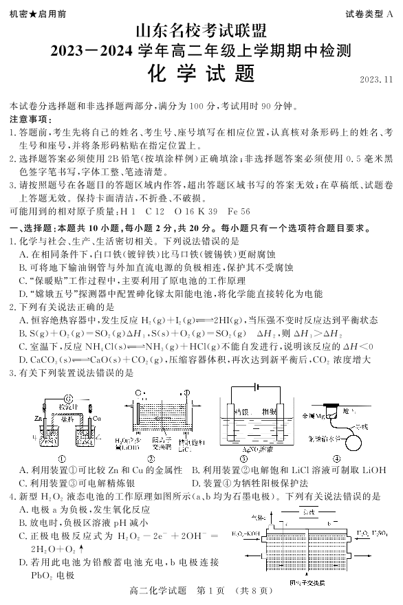 山东省名校考试联盟2023-2024学年高二上学期期中考试化学