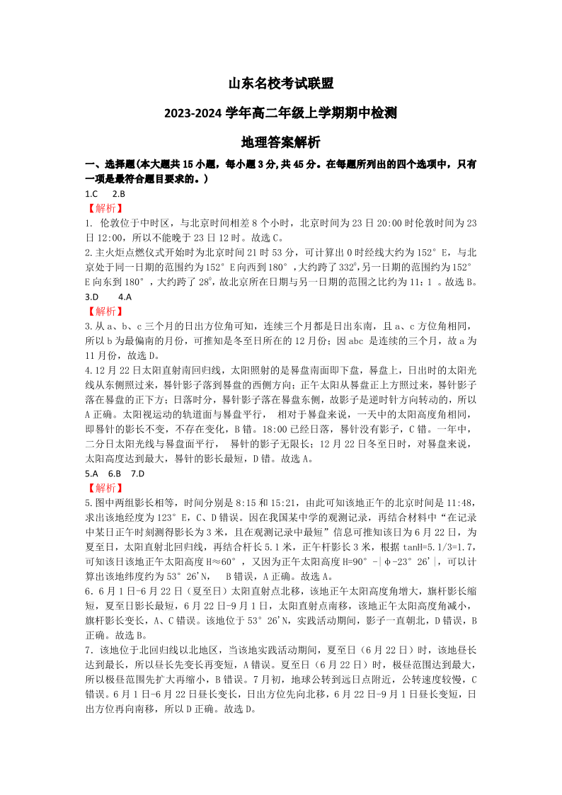 山东省名校考试联盟2023-2024学年高二上学期期中考试地理答案