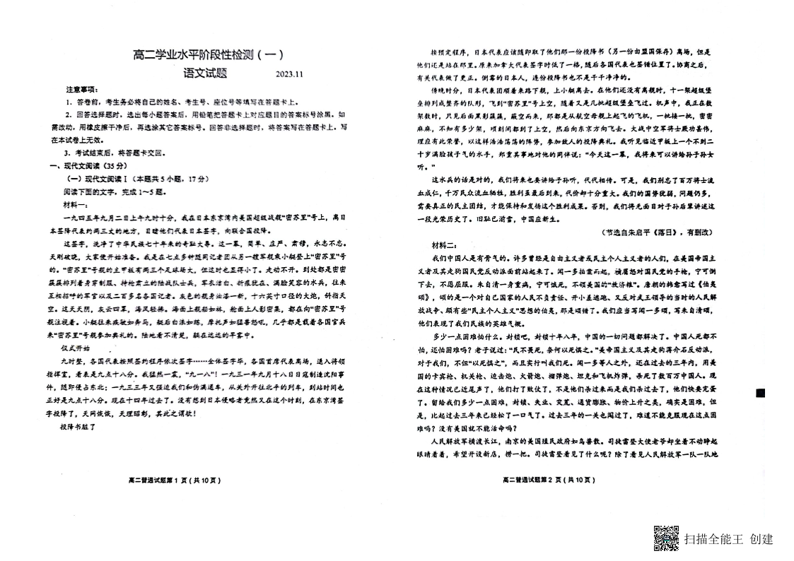 山东省青岛市莱西市2023-2024学年高二上学期11月期中试题语文