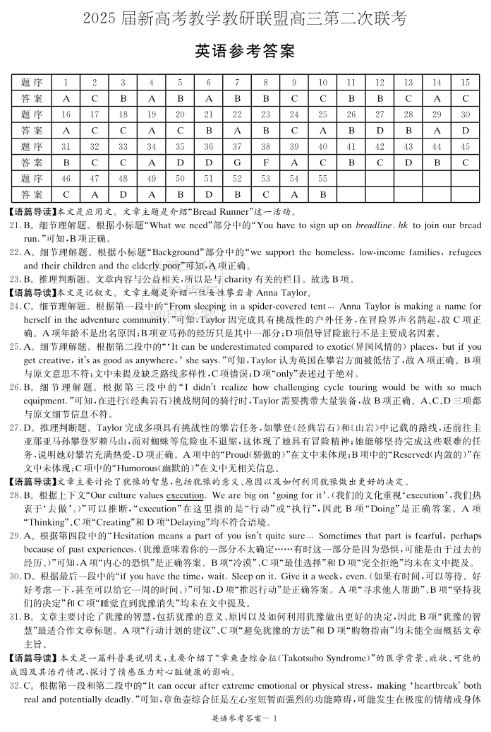 湖南省新高考教学教研联盟2024-2025学年高三第二次联考英语答案