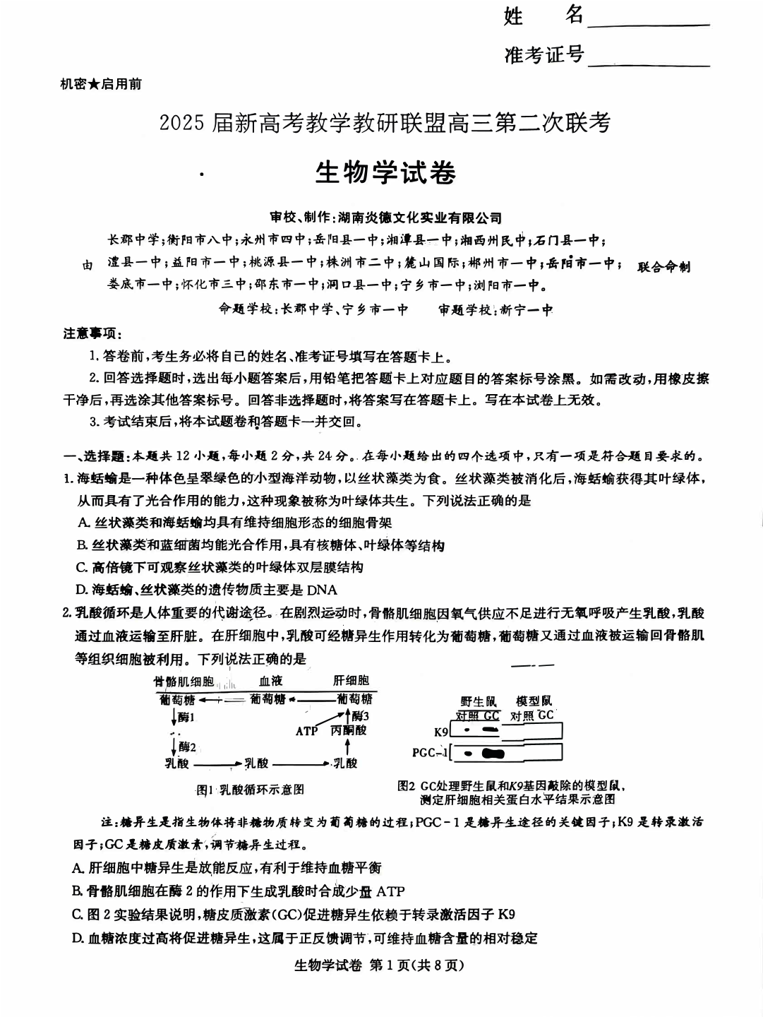 湖南省新高考教学教研联盟2024-2025学年高三第二次联考生物