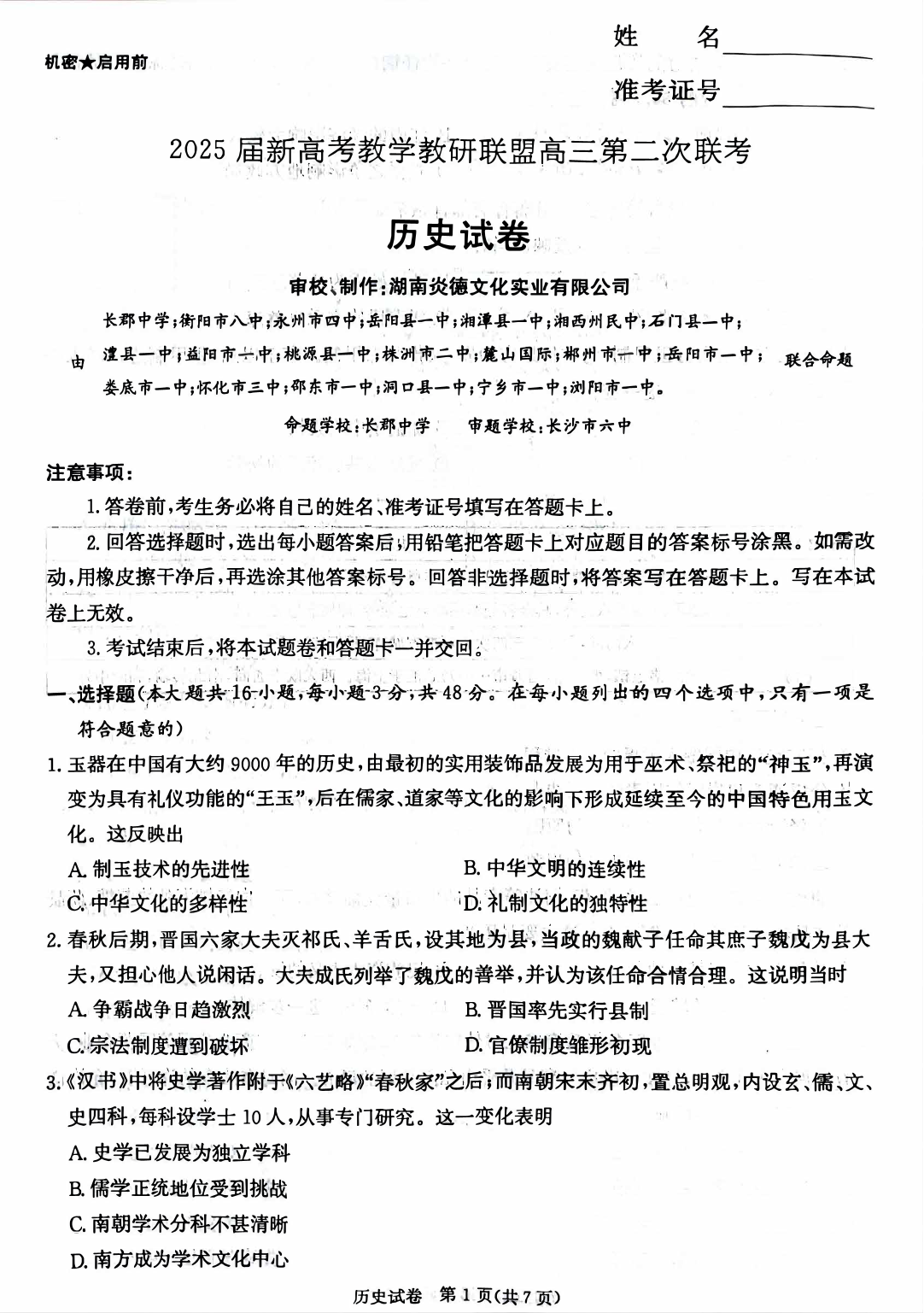湖南省新高考教学教研联盟2024-2025学年高三第二次联考历史