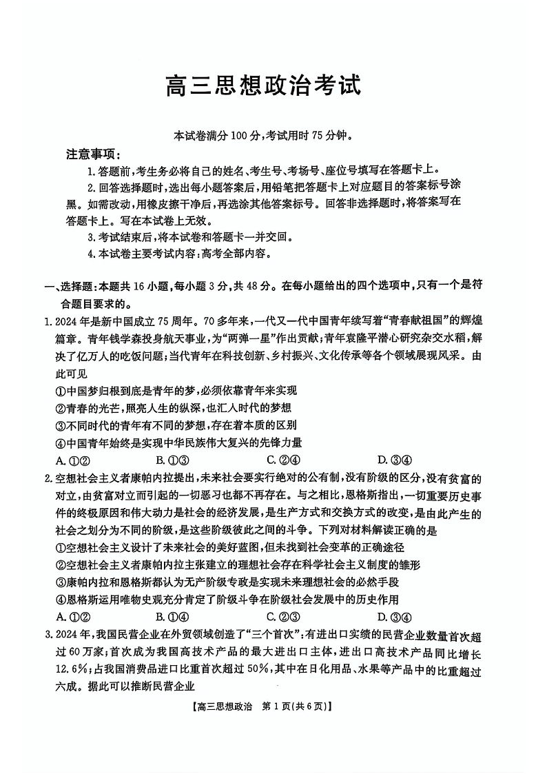全国优创名校2024-2025学年下学期4月高三跨省域联考政治+答案