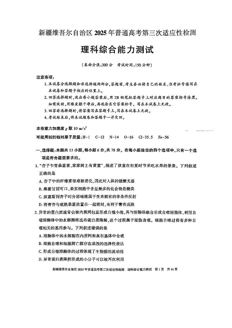 新疆维吾尔自治区2024-2025学年下学期高三三模适应性检测理综