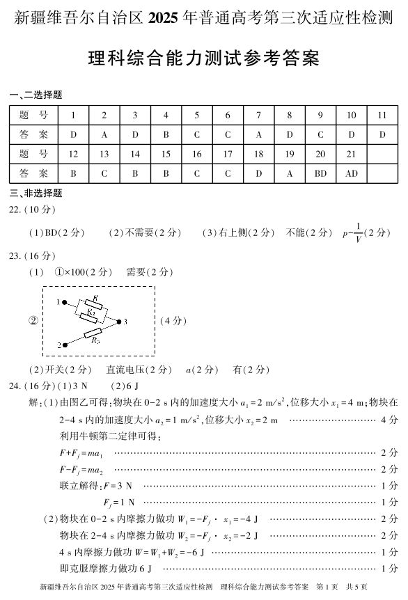 新疆维吾尔自治区2024-2025学年下学期高三三模适应性检测理综答案