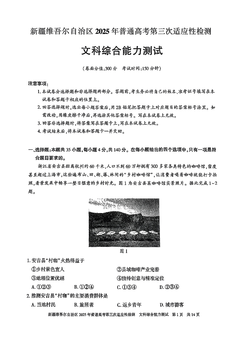 新疆维吾尔自治区2024-2025学年下学期高三三模适应性检测文综