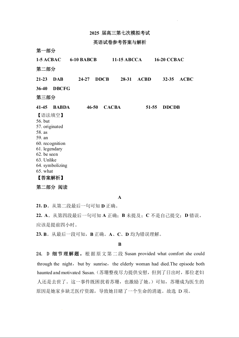 辽宁省本溪市高级中学2024-2025学年下学期高三七模英语答案