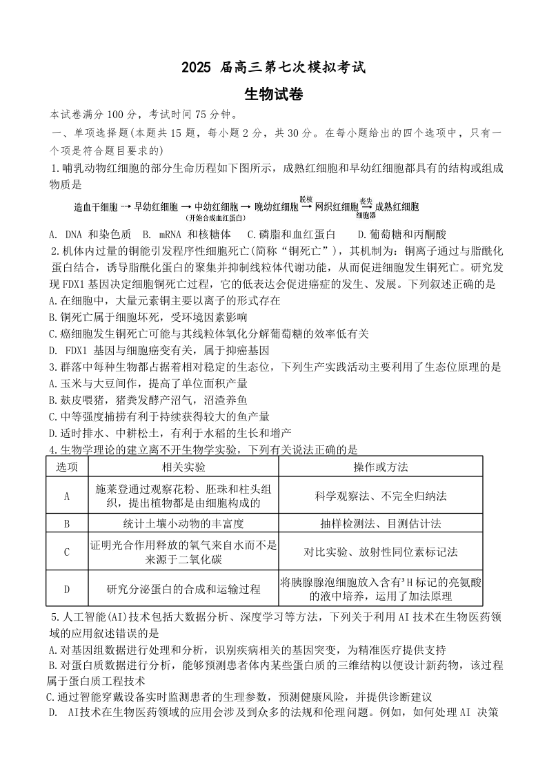 辽宁省本溪市高级中学2024-2025学年下学期高三七模生物