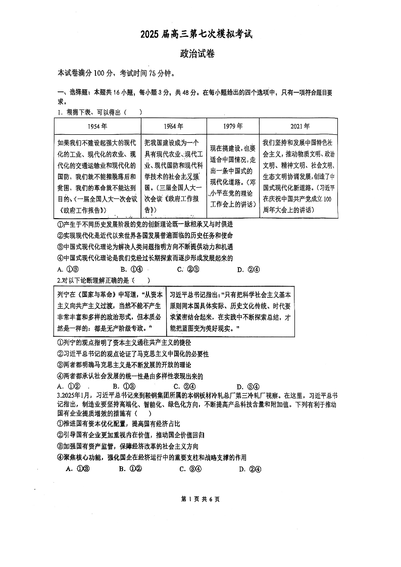 辽宁省本溪市高级中学2024-2025学年下学期高三七模政治