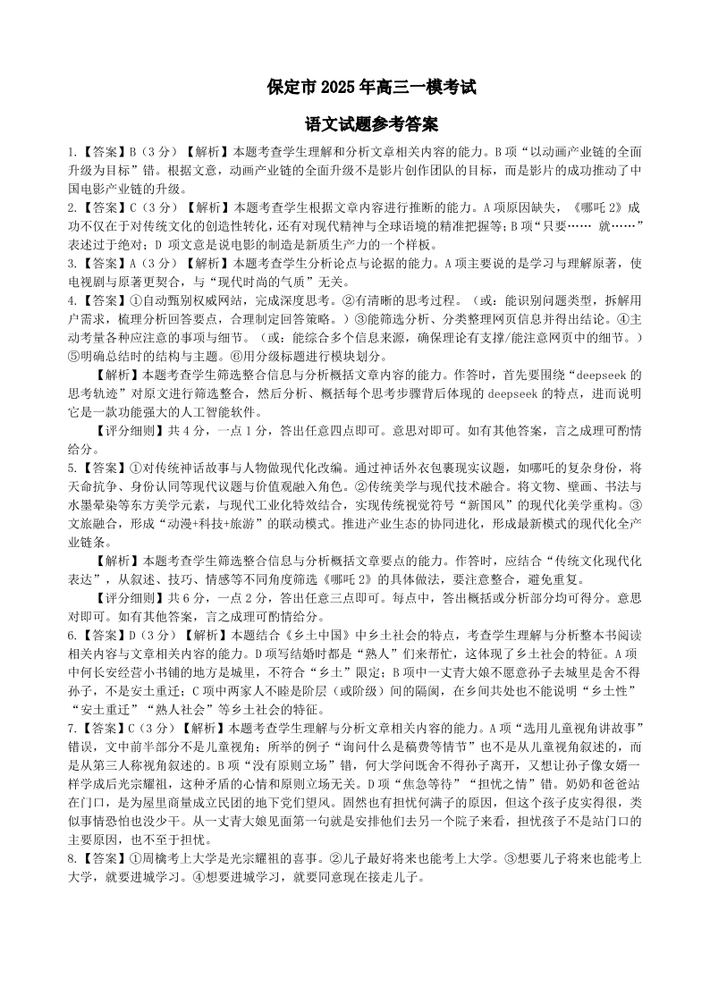 河北省保定市2024-2025学年下学期高三一模统考语文答案