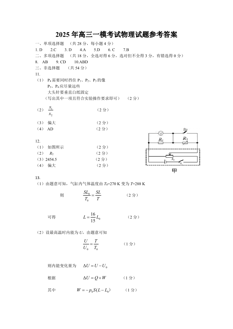 河北省保定市2024-2025学年下学期高三一模统考物理答案