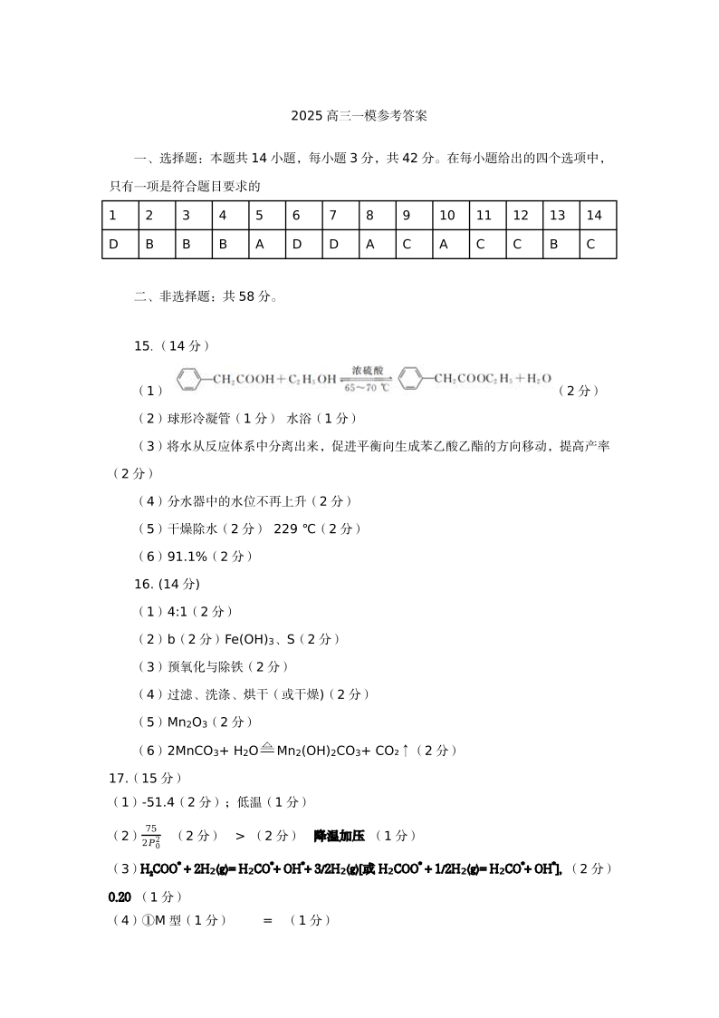 河北省保定市2024-2025学年下学期高三一模统考化学答案