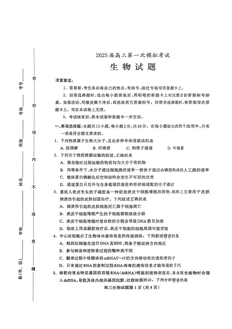 河北省保定市2024-2025学年下学期高三一模统考生物