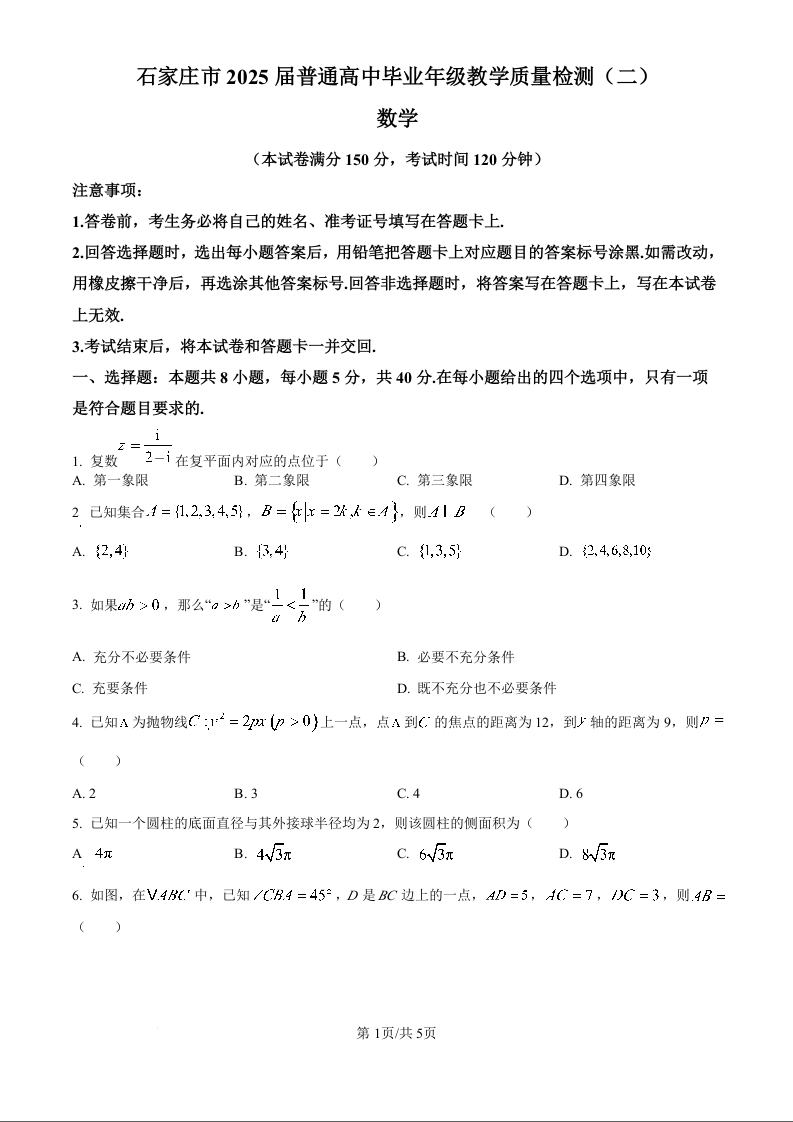 河北省石家庄市2024-2025学年下学期高三二模质检数学(原卷版)