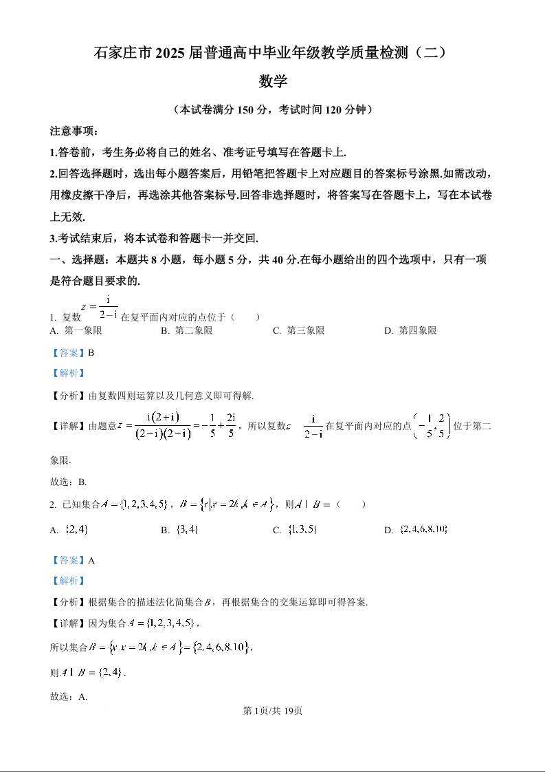 河北省石家庄市2024-2025学年下学期高三二模质检数学(精品解析版)