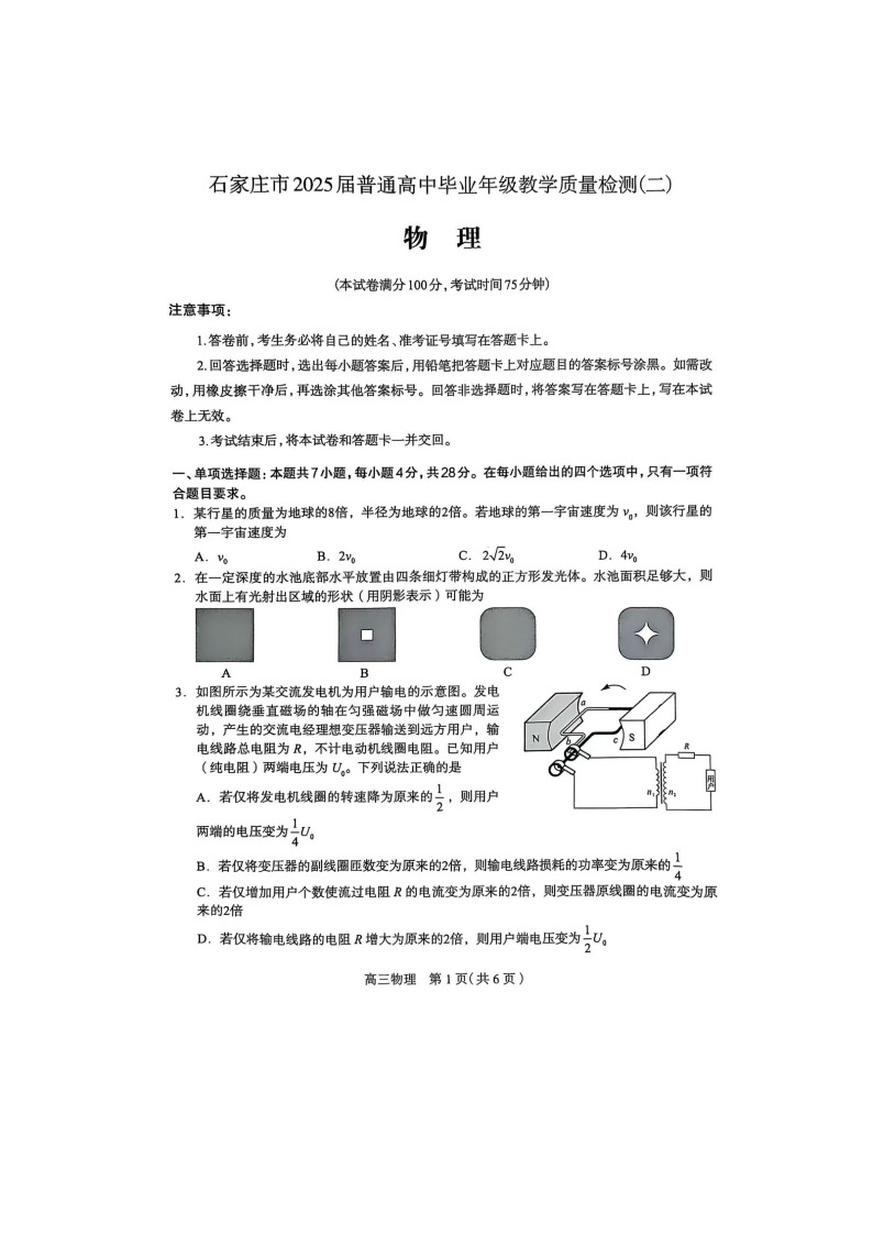 河北省石家庄市2024-2025学年下学期高三二模质检物理