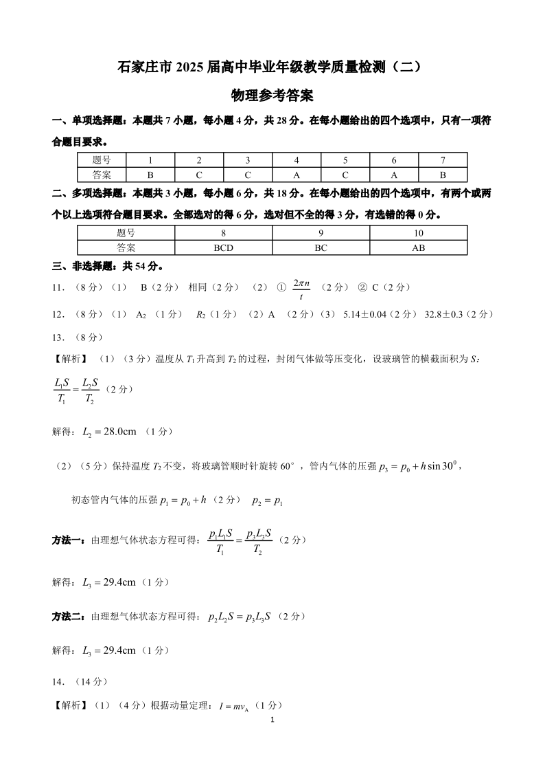 河北省石家庄市2024-2025学年下学期高三二模质检物理答案