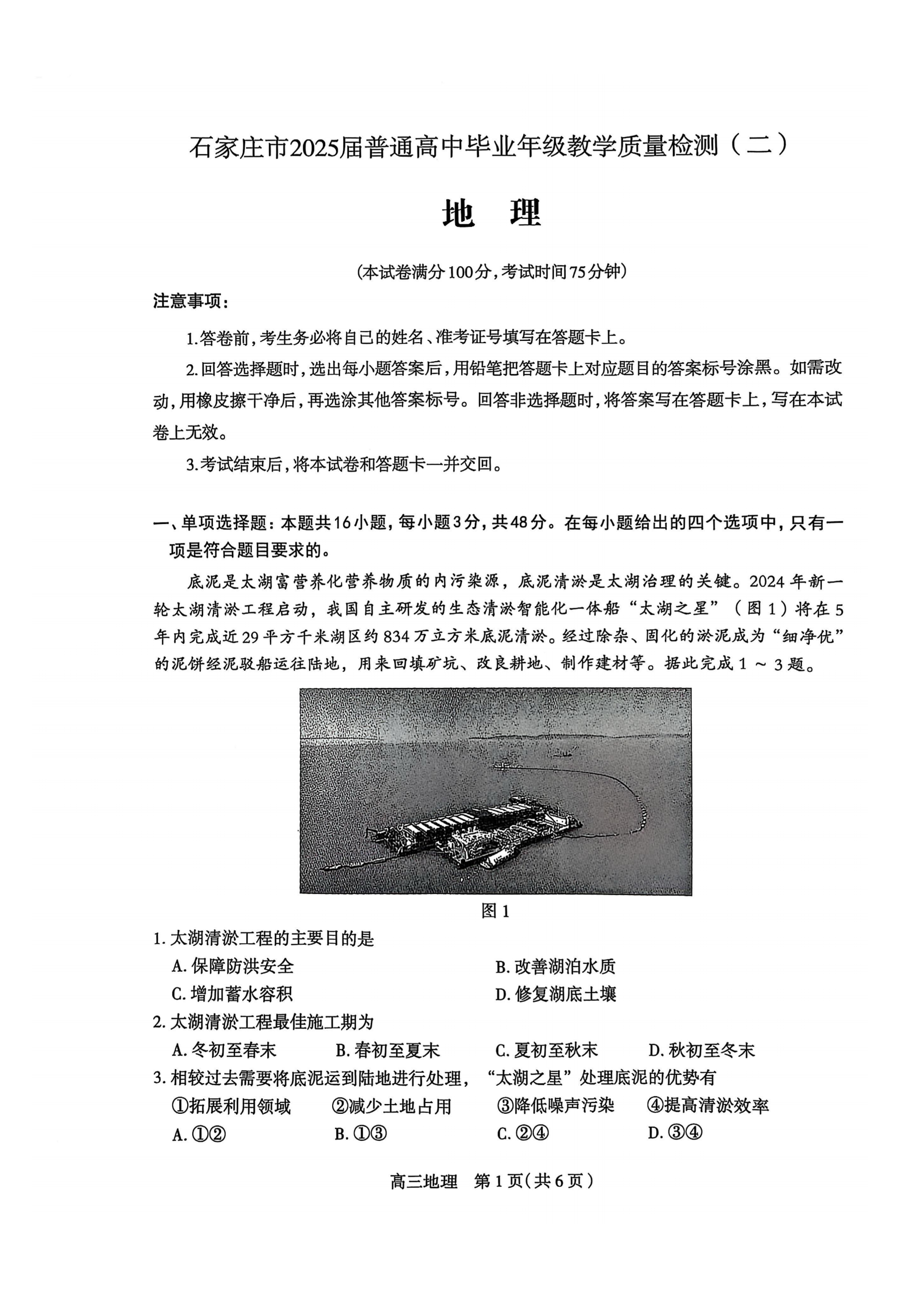 河北省石家庄市2024-2025学年下学期高三二模质检地理+答案