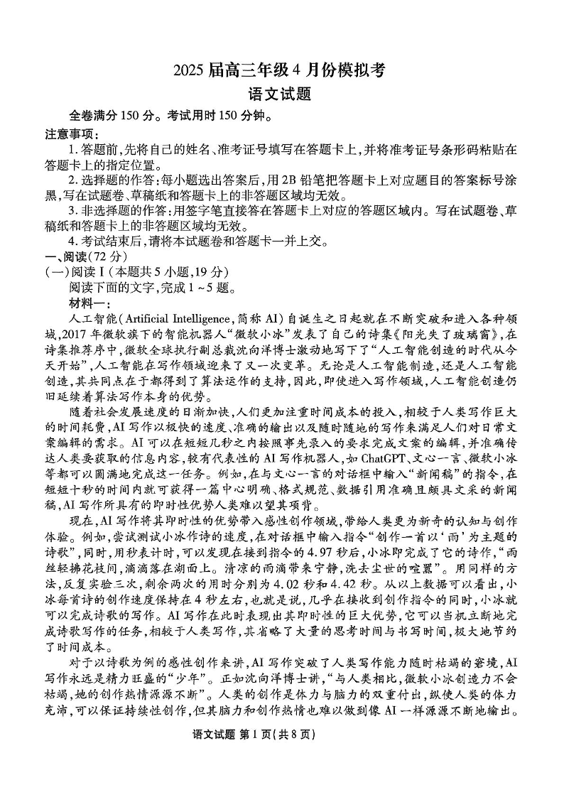 山东省区域衡水金卷2024-2025学年下学期4月份高三模拟语文+答案