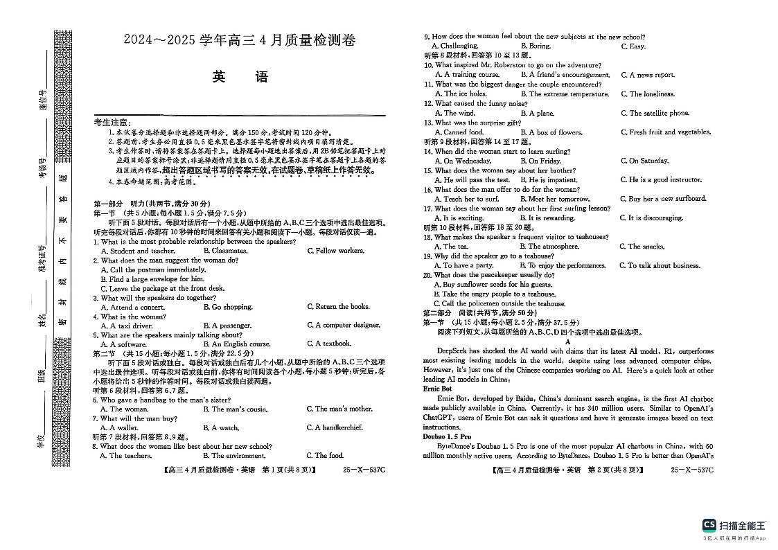 山西省三晋卓越联盟2024-2025学年下学期4月高三质量检测英语