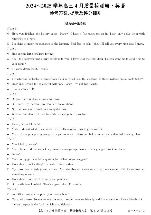 山西省三晋卓越联盟2024-2025学年下学期4月高三质量检测英语答案