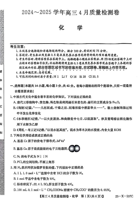 山西省三晋卓越联盟2024-2025学年下学期4月高三质量检测化学