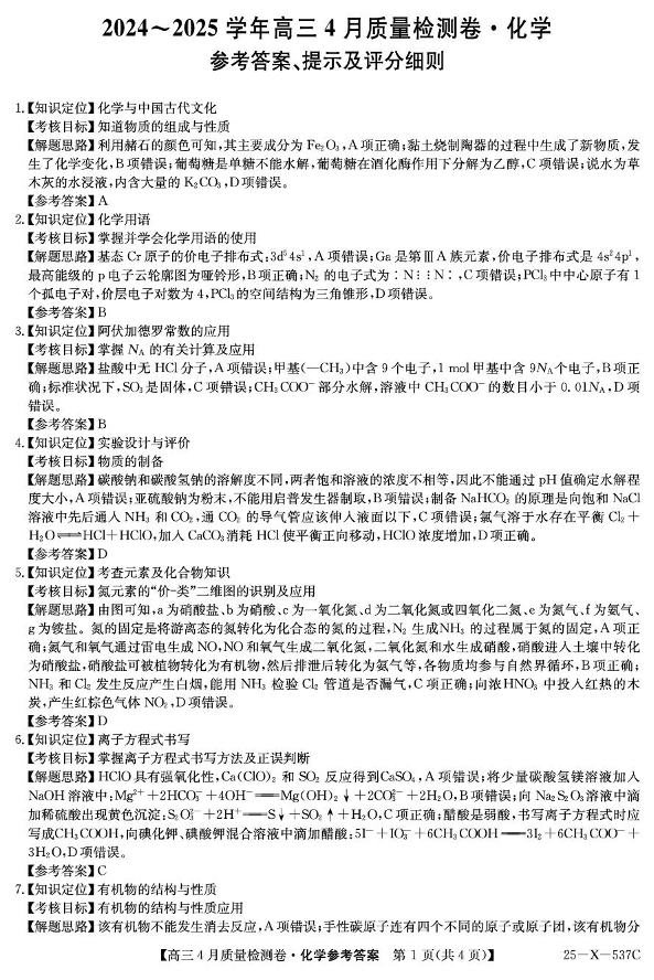 山西省三晋卓越联盟2024-2025学年下学期4月高三质量检测化学答案