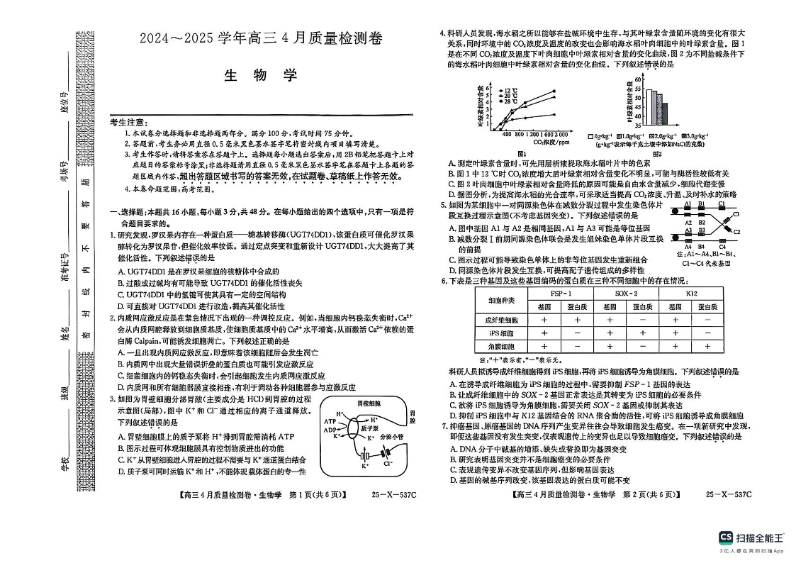 山西省三晋卓越联盟2024-2025学年下学期4月高三质量检测生物
