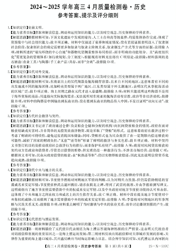山西省三晋卓越联盟2024-2025学年下学期4月高三质量检测历史答案