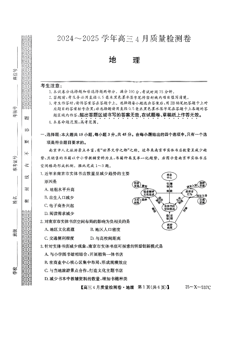 山西省三晋卓越联盟2024-2025学年下学期4月高三质量检测地理