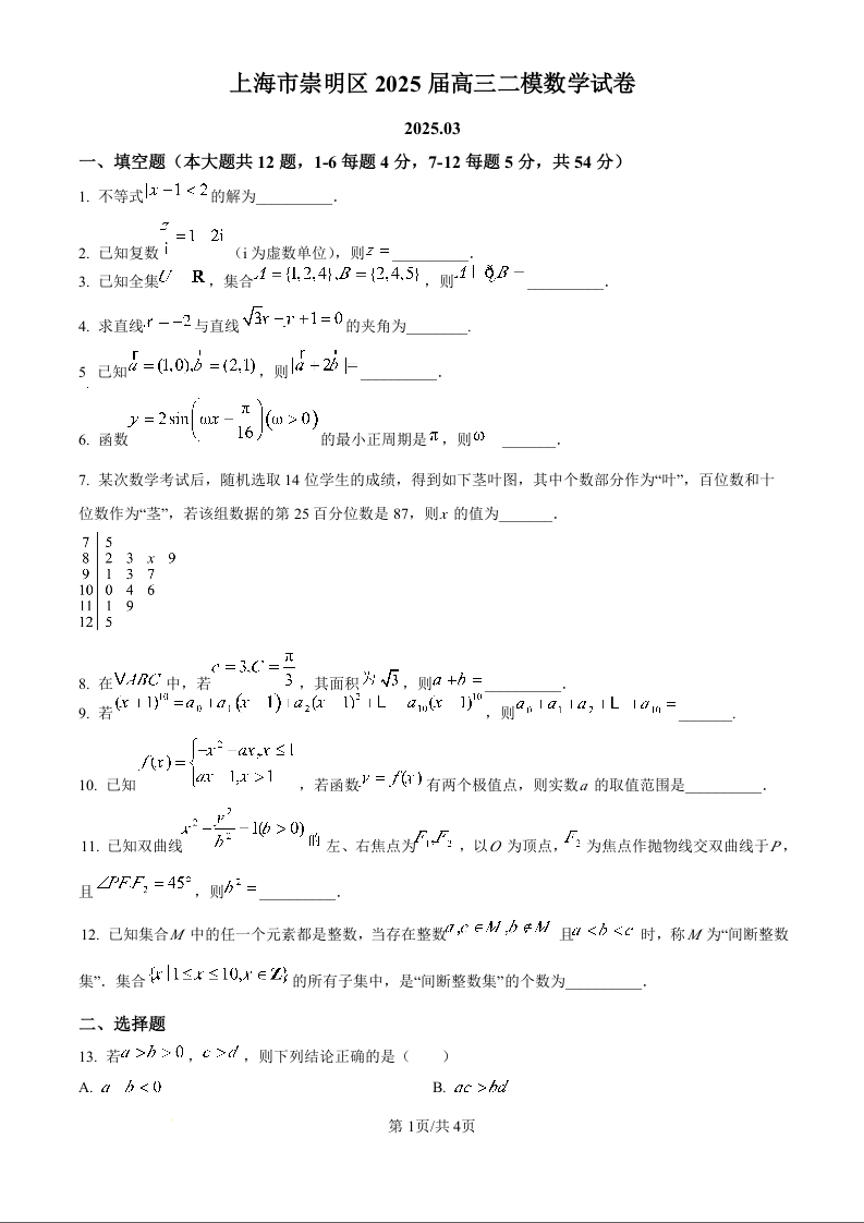 上海市崇明区2024-2025学年下学期高三第二次模拟考试数学