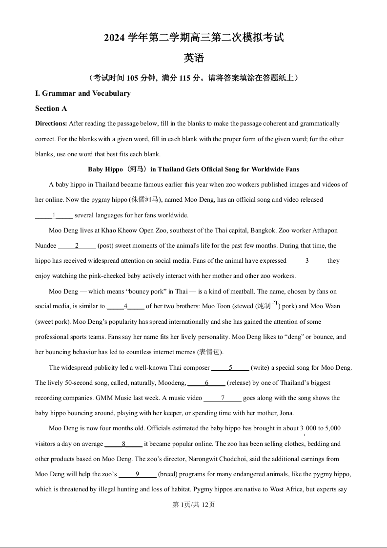 上海市崇明区2024-2025学年下学期高三第二次模拟考试英语