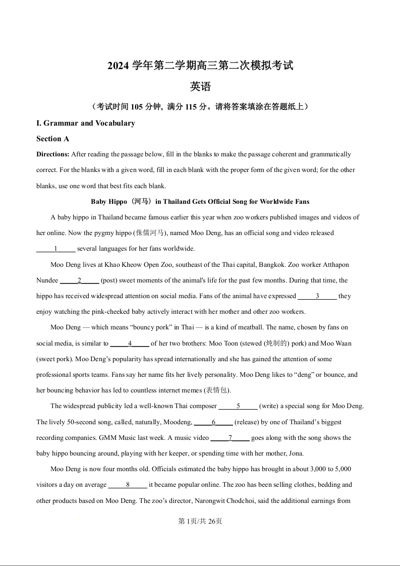 上海市崇明区2024-2025学年下学期高三第二次模拟考试英语答案