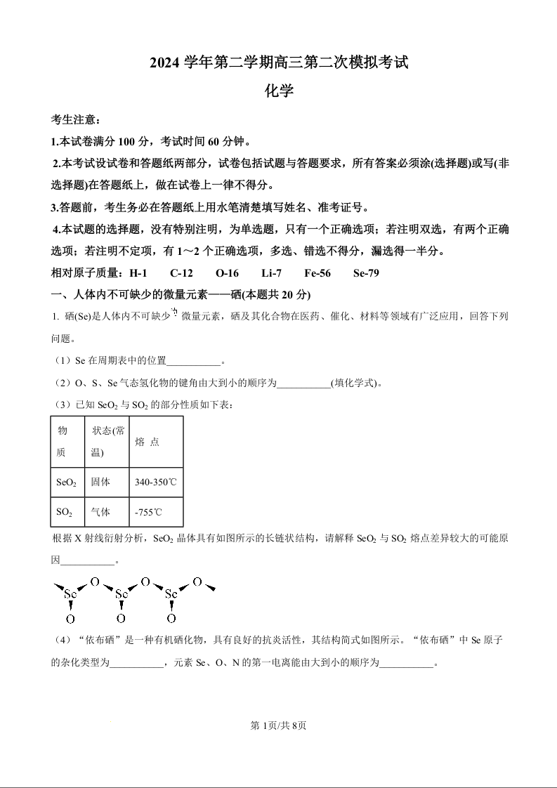 上海市崇明区2024-2025学年下学期高三第二次模拟考试化学